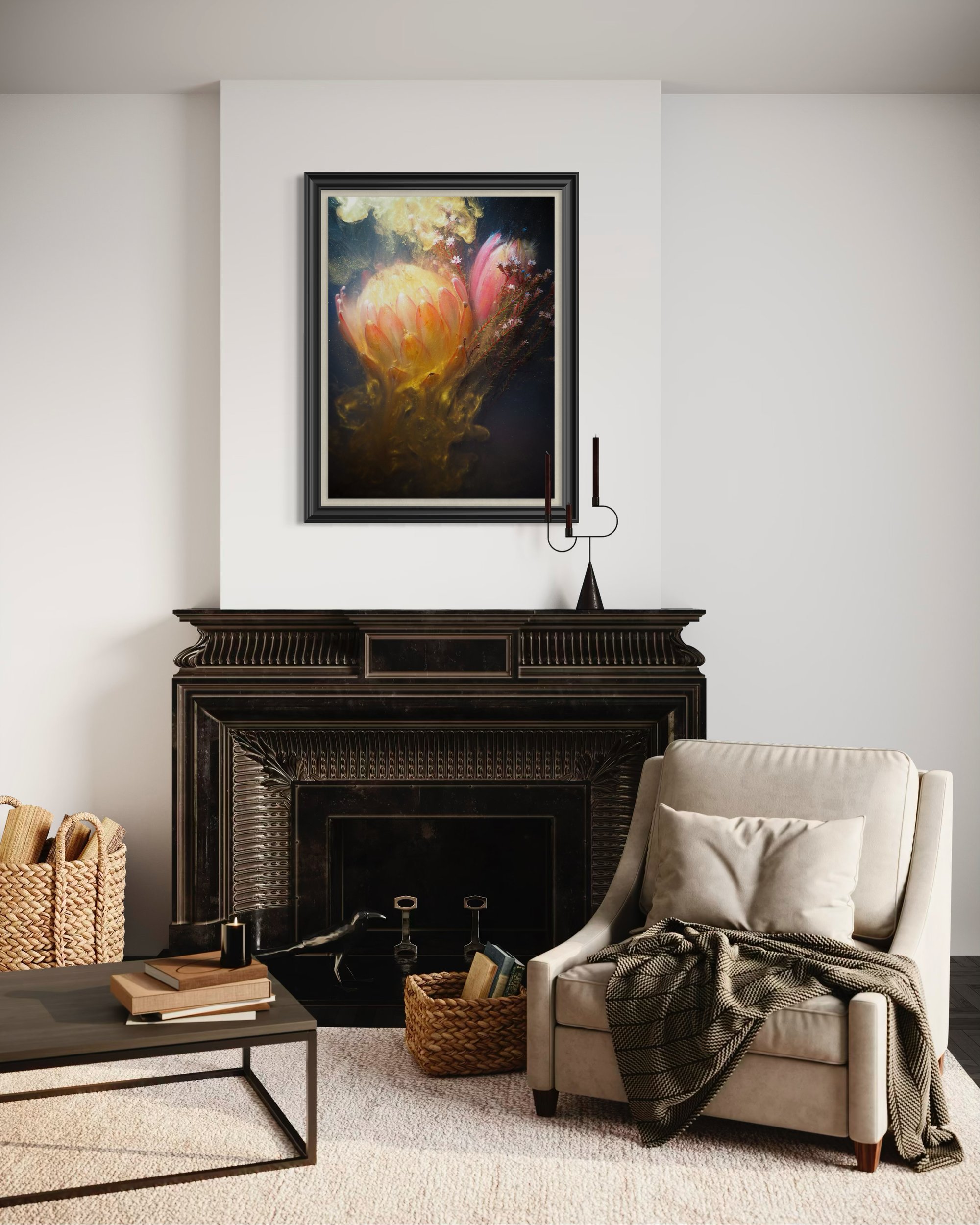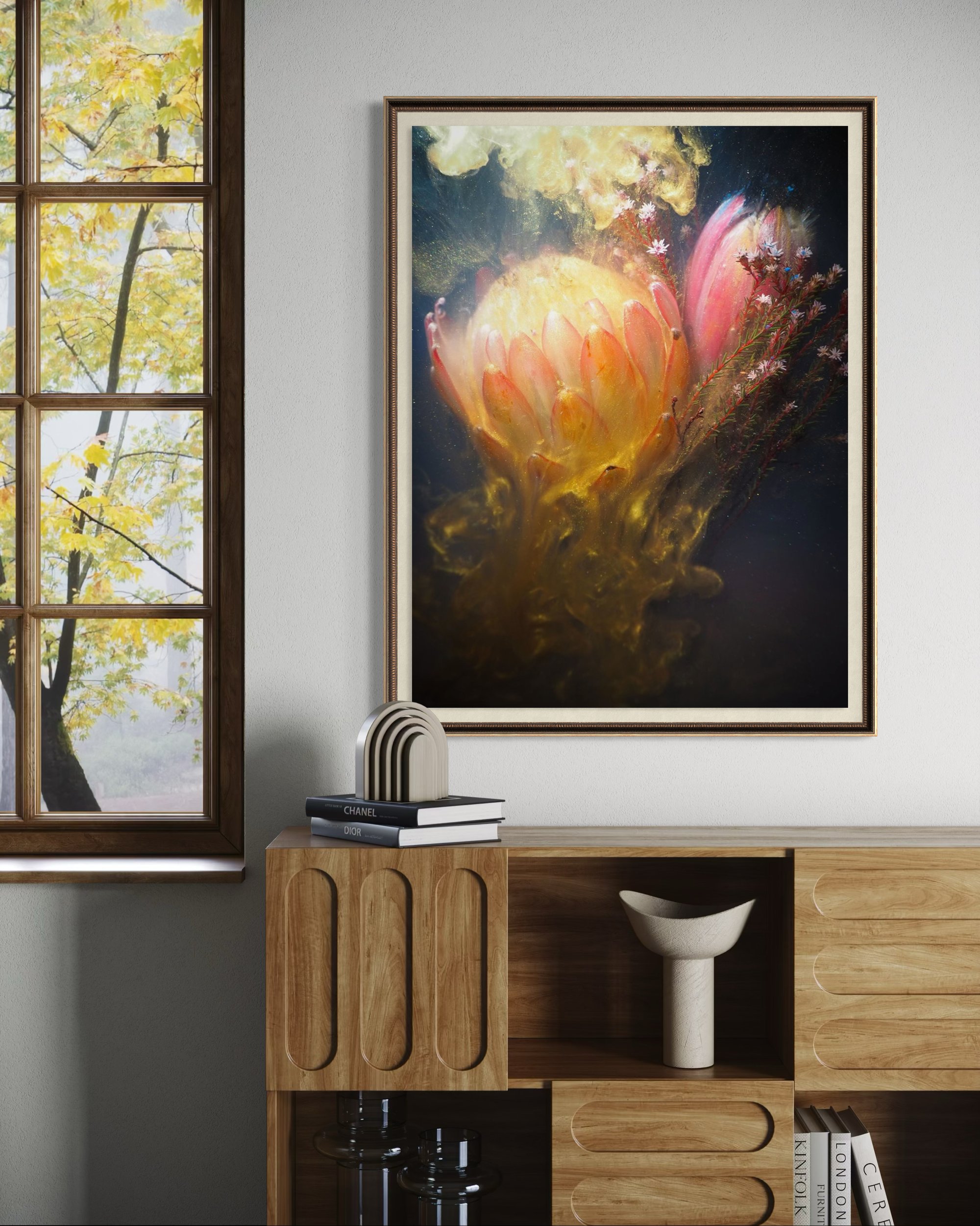 Awash in molten light, Protea in Gold captures the regal stillness of a flower born of fire. Golden currents curl around its petals like breath, illuminating every fold with quiet strength. The Protea — long a symbol of transformation, courage, and diversity — stands here as a radiant emblem of resilience and rebirth.