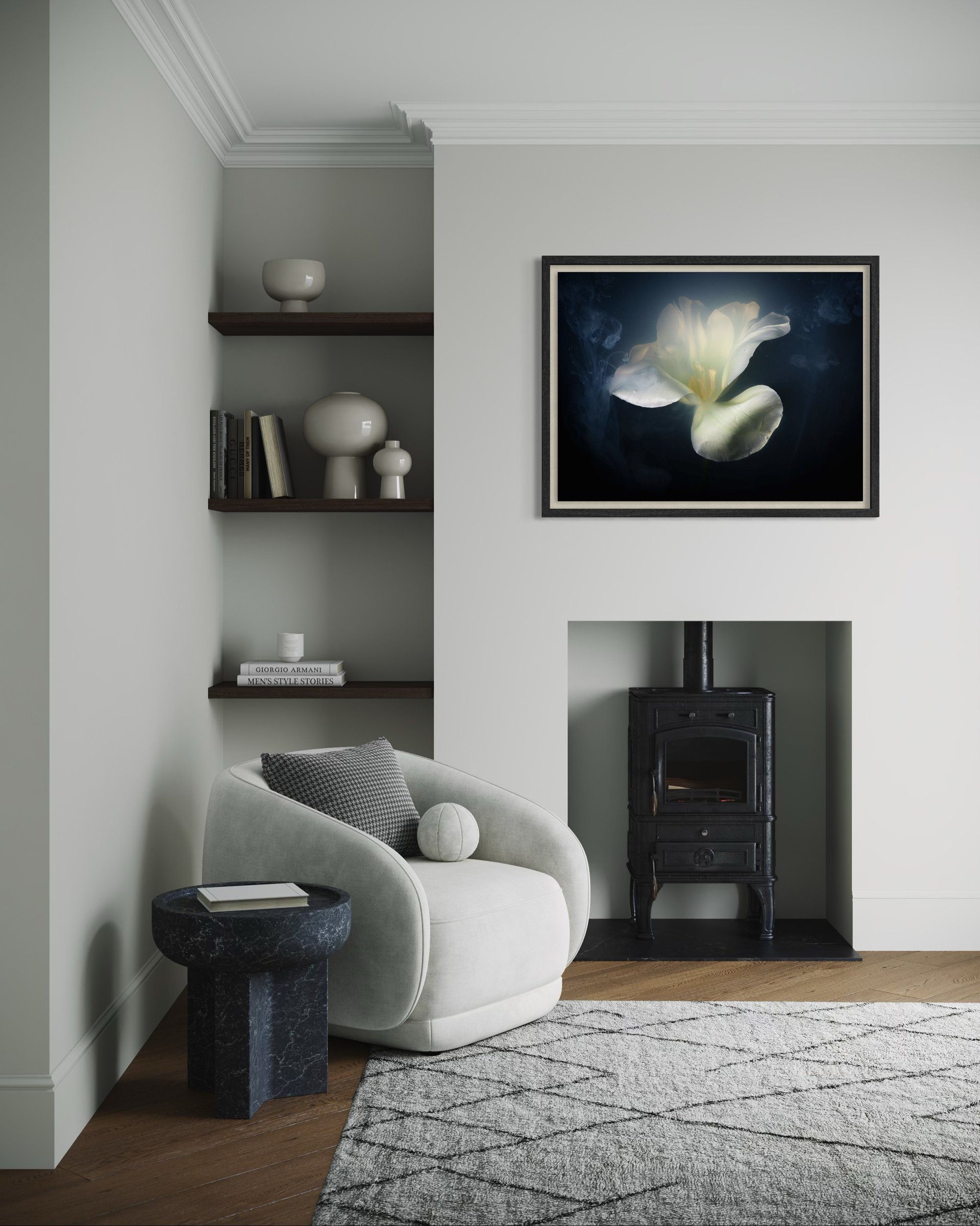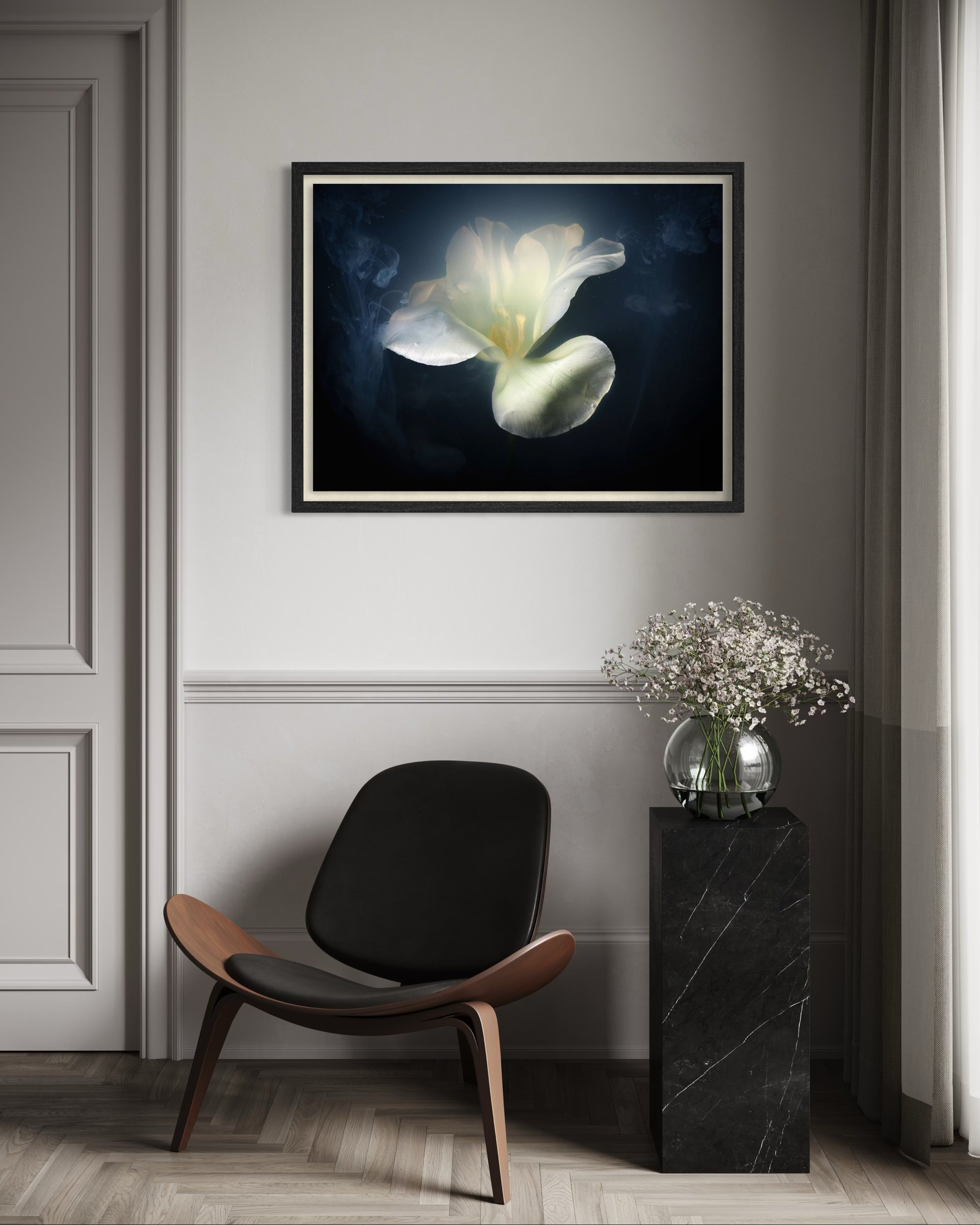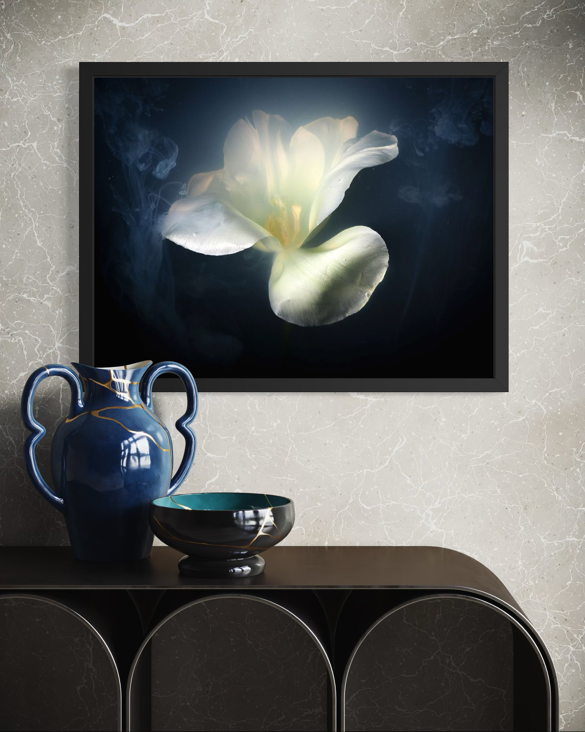A single white tulip drifts in darkness, its petals unfolding like whispers of light through water. White Tulip in Shadow captures the quiet tension between purity and obscurity — a moment of stillness where form dissolves into mystery. A fine art print that captures a fleeting moment of radiance beneath the surface. The tulip seems to hover in a quiet dreamscape — glowing, weightless, and serene — surrounded by whispering trails of mist and shadow.